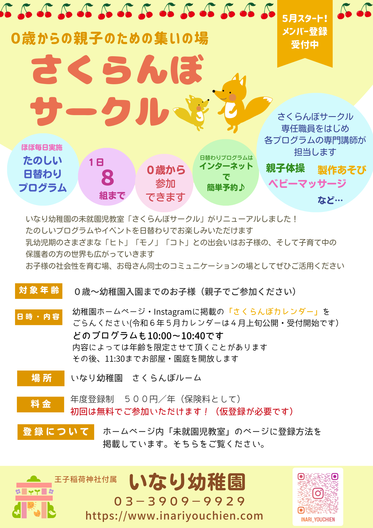 | 内容 | 親子体操や製作あそび、ベビーマッサージ、親子ヨガなど…日替わりでいろいろなプログラムを実施します。さくらんぼサークル専任職員をはじめ、各プログラムの専門講師をお呼びしてみなさんと楽しい時間を過ごします。(プログラムの内容によっては、年齢を限定させていただくことがあります) 幼稚園ホームページ・Instagram・LINE公式アカウントに掲載の「さくらんぼカレンダー」をご覧ください。 |