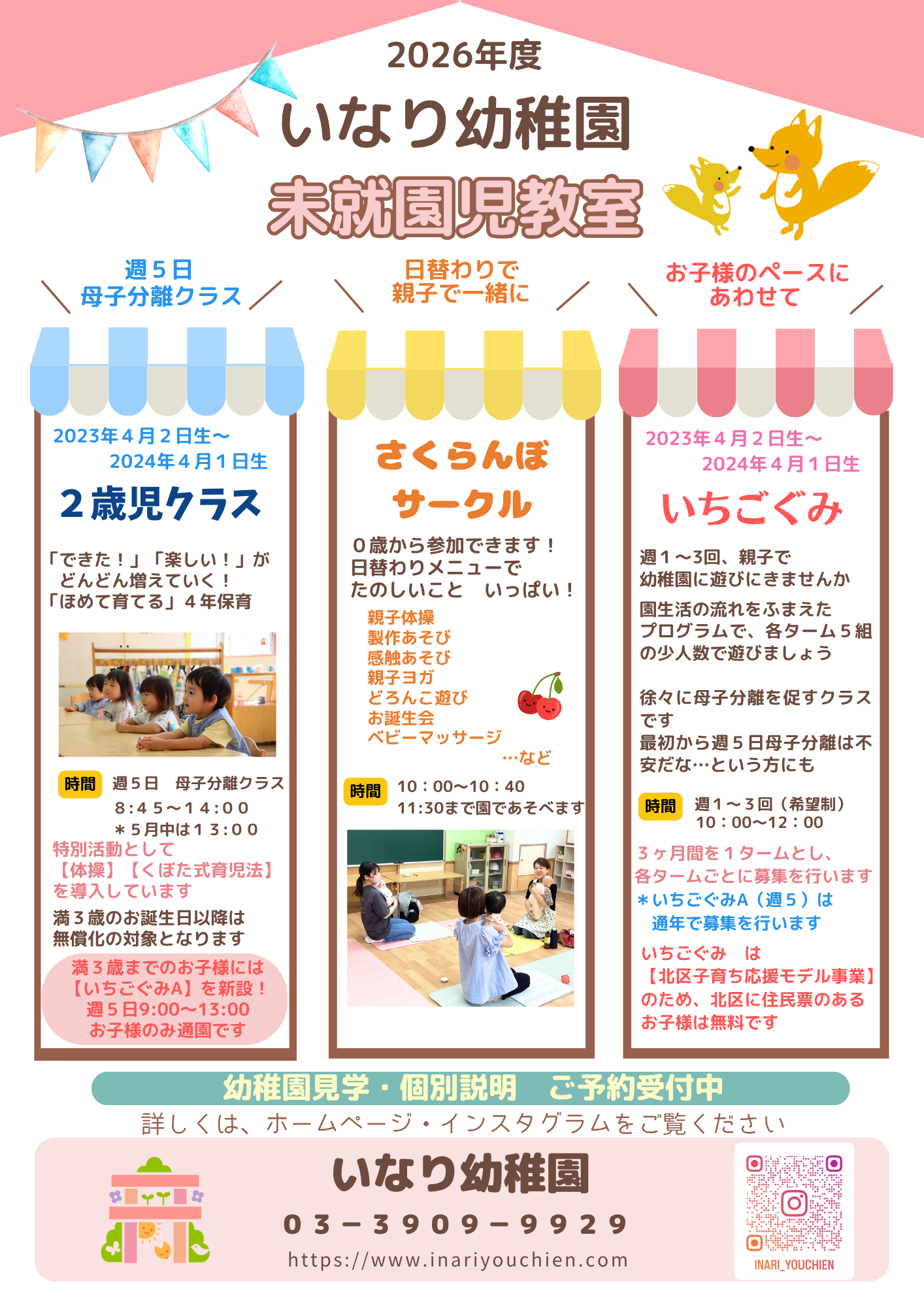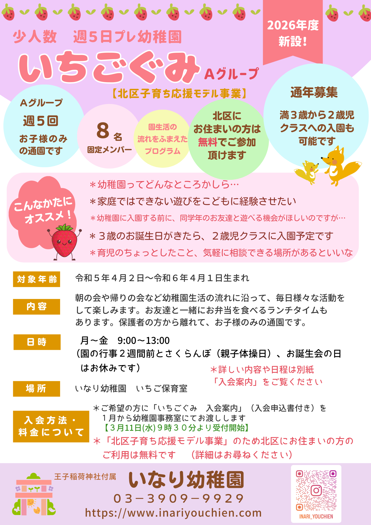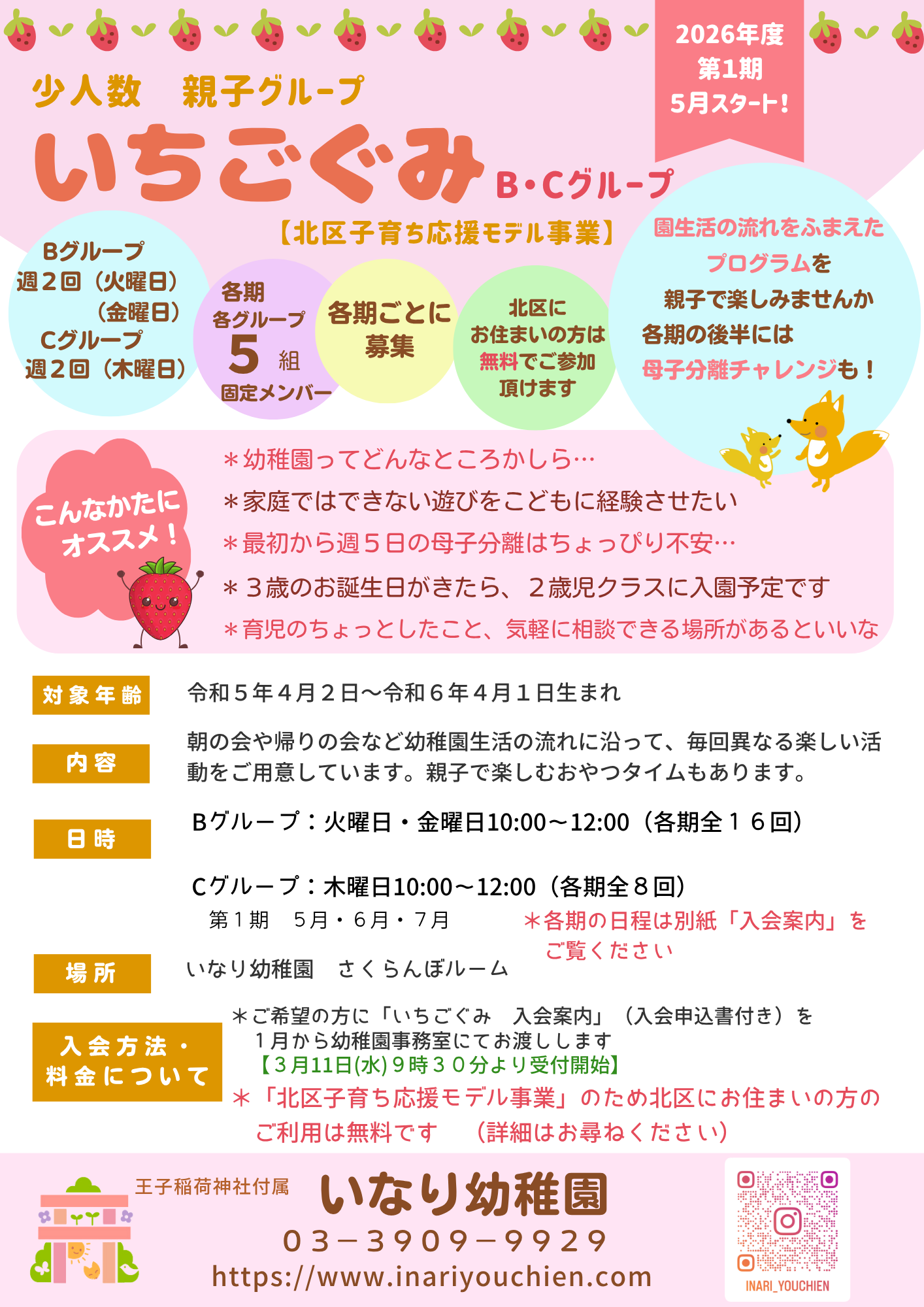 | 費用 | 入会費を含めた詳細は「いちご組 入会案内」に記載しています。 *いちごぐみは「北区子育ち応援モデル事業」のため、北区に住民票のあるお子様は全コース無料です。 入会案内をご希望の方は、幼稚園事務室にお越し頂くか、ホームページの問い合わせフォーム、公式LINEアカウントのメッセージからご請求ください。 |